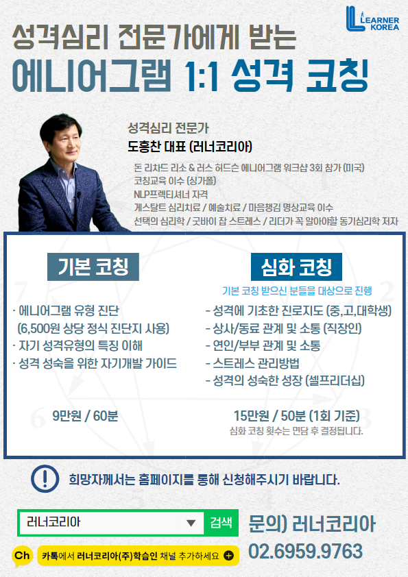 에니어그램 1:1 성격코칭 (기본/심화) 2020년 4월 9일 에니어그램 1:1 성격코칭 (기본/심화) print 회복력(Resilience) 능력진단 및 전문강사 양성과정 퇴직예정자 재취업(전직)지원서비스 프로그램 설계과정 Posted by 러너코리아 in 0 Comments 교육일정 상시 강사 도흥찬 대표 (러너코리아) 대상자 - 진로에 고민있는 중고대학생 - 관계를 증진시키고 싶은 연인/부부 - 상사/동료와의 관계를 증진시키고 싶은 직장인 - 스트레스 관리방법의 이해와 성격의 성숙한 성장을 희망하는 누구나 준비사항 참가비 [기본코칭] 60분 90,000원 [심화코칭] 50분 150,000원 제공사항 할인혜택 교육장소 서울시 서초구 서초대로 56길 28 STS빌딩 3층(교대역 1번 출구 5분 거리) 신청방법 홈페이지 신청 문의처 02-6959-9763 메일 플러스친구 교육안내문 다운 카카오톡 플러스 친구추가 More Print2022년 3월 9일 강사 :도흥찬 강사 에니어그램 1:1 성격 코칭 신청하기 에니어그램 1:1 코칭 신청서 신청서를 작성 및 제출해주시면, 담당자가 유선연락 후 날짜/시간을 픽스합니다. 에니어그램 1:1 성격 코칭 신청서* 일정을 선택해주세요 - 기본 코칭 (7만원/60분) - 심화 코칭 (기본 코칭을 받으신 분들만 신청 가능하며, 별도 문의주시기 바랍니다.) 이름* 휴대폰 번호* 회사명* 부서 / 직급 이메일주소* 신청 계기 print 관련 Tags:에니어그램, 코칭 Share this article: 0 Comments Leave a reply Click here to cancel the replyYou must be logged in to post a comment.